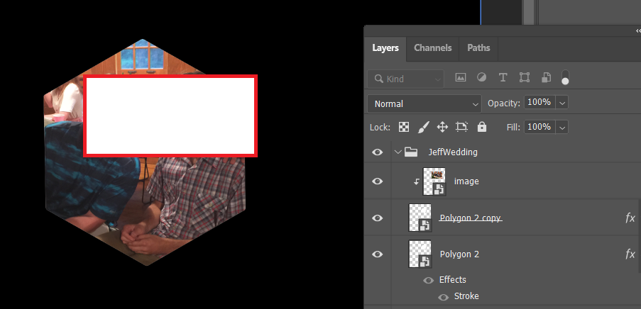 - Highlight top 2 layers and click the line between the top and middle layers and create a clipping mask. This works and my image is show in the hexagon but no stroke is seen from the bottom layer